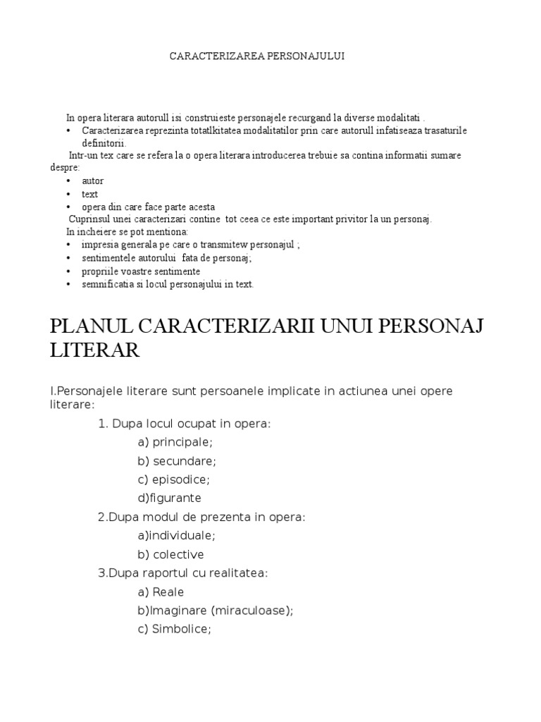 Planul Compunerii De Caracterizare A Personajului Literar